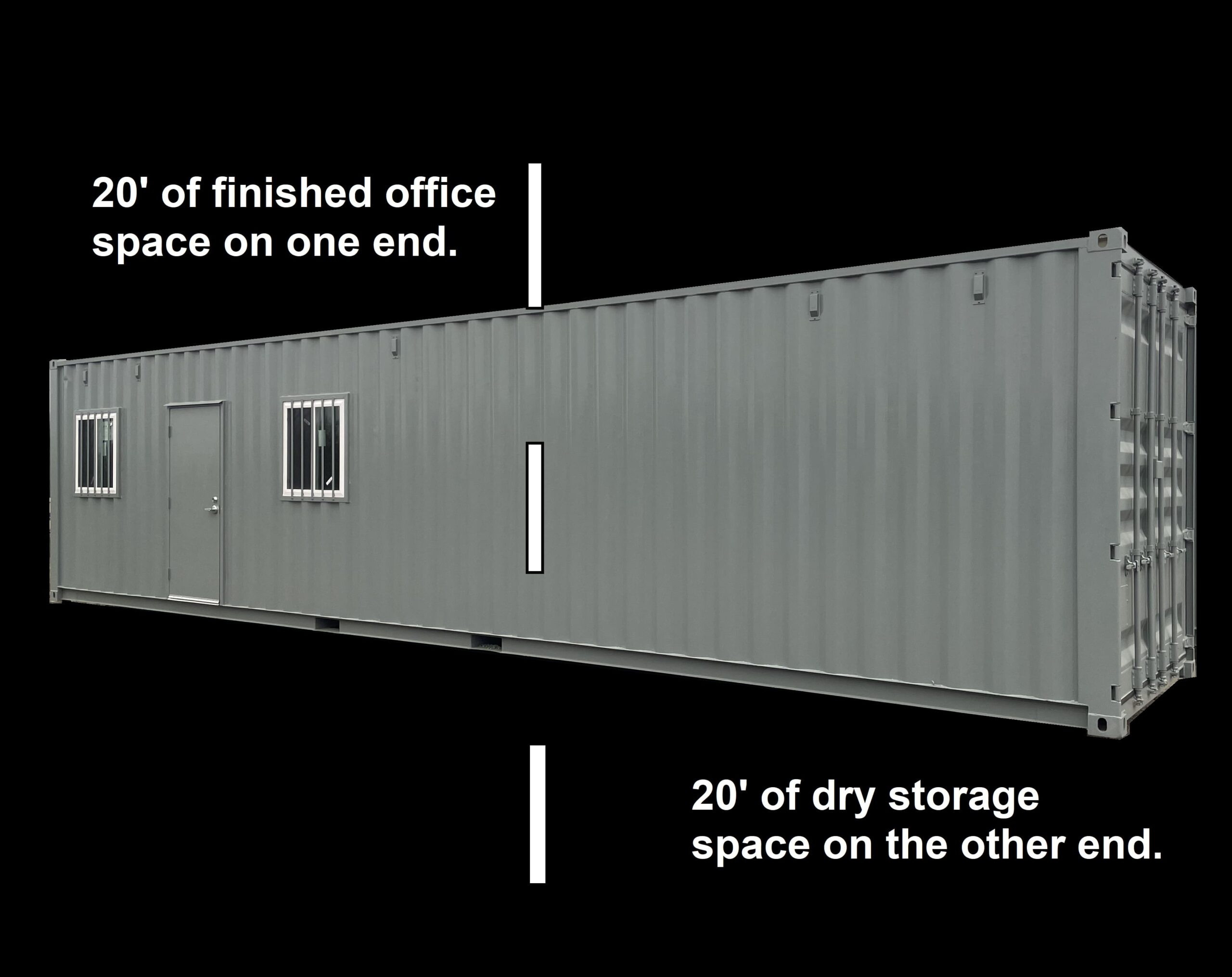 Our portable offices are built to endure tough job sites through all seasons, whether it’s freezing winters or scorching summers. We offer 20′ office containers, 40′ office/storage combo units and 40′ jobsite offices for rent or purchase. These office containers are ideal for construction sites, home offices, church offices, or even a personal man cave.